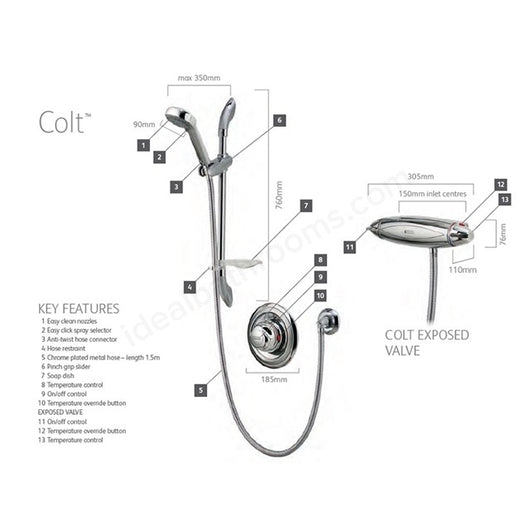 The Colt mixer shower is the perfect illustration that elite performance and style does not necessarily come at an unaffordable price. Because of this; Colt provides the ideal package for families and first time shower purchasers. Precise temperatures and water flow are driven by our thermostatic bi-metallic valve technology to deliver exceptional showering quality. The exposed design is complemented by an elliptical control whilst the concealed shower offers an understated curved control; making both options excellent additions to the modern bathroom.