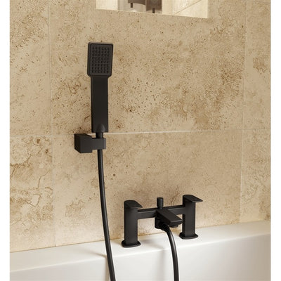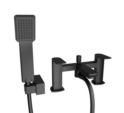 The high performance; deck mounted Downtown Bath Shower Mixer Tap has the dual functionality of a bath filler and handheld shower attachment. A simple diverter knob switches the water flow between the bath tap and shower head. Dual lever operation allows the easy mix of hot and cold supplies to the desired water temperature. A modern; chamfered edge design; in the aesthetically popular matt black colour finish; creates a distinctively contemporary and stylish look when coordinated with other bathroom fixtures and fittings. Supplied with an 65mm square shower head and accompanying brass holder; this flexible; family-friendly BSM tap works on all plumbing systems and comes with a full 5 year guarantee