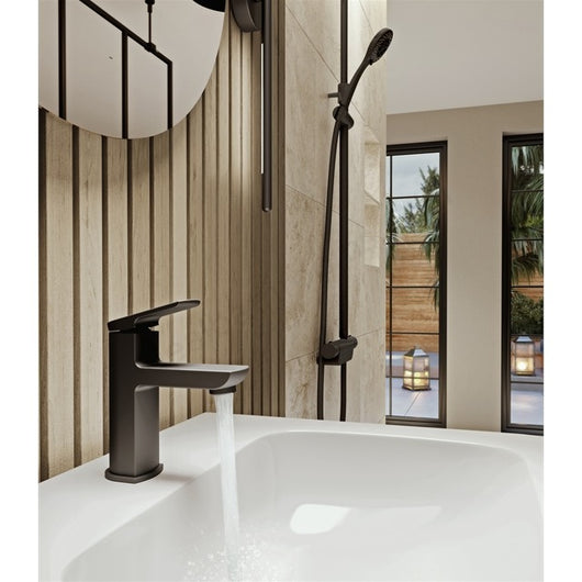 This high performance; Downtown Basin Mixer Tap is a striking; monobloc tap design for all larger basin installations. The quality matt black colour finish creates a distinctively contemporary and stylish look when coordinated with other bathroom fixtures and fittings. The single; soft squared paddle lever smoothly adjusts to the desired water temperature and an integrated aerator provides a softer; non-splash flow. The efficient internal waterway design ensures excellent flow rates from all plumbing systems. Robust as well as stylish; Downtown mixer taps have a solid brass body with durable zinc handles.