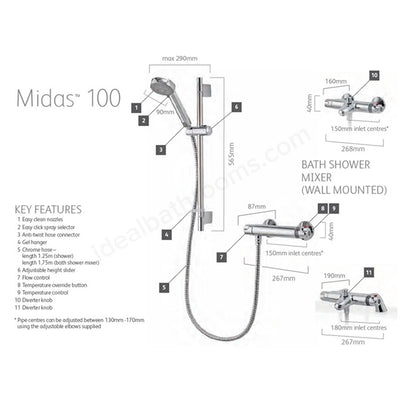 Slim and stylish; Aqualisa Midas 100 provides quality construction as a compact bar mixer shower. Featuring sleek temperature and flow controls; Midas boasts the added bonus of a temperature override button for added family safety. Combining modern styling with great performance; Midas features a 90mm Harmony shower head with a choice of 4 impressive spray patterns and comes complete with easy clean nozzles. Perfect for a family bathroom and suited to a gravity fed; high pressure or combi boiler water system; Midas 100 also comes with an incredible 5 year guarantee as standard.
