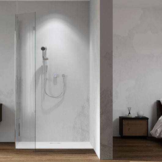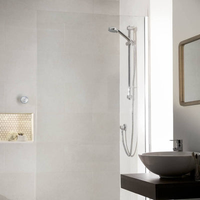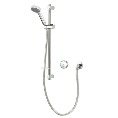 Quartz Blue Smart is now fitted with the new and improved SmartValve™ that delivers the most advanced showering systems available in terms of safe, regulated temperature control and eco-friendly water usage. This is an adjustable handset, hose and slide rail combination, connected to a wall mounted water outlet. The simple, circular control sits discretely on the tiled wall surface. Behind it, a single cable easily connects to the intelligent SmartValve™, which can be placed in the most accessible location 7.5 metres away from the shower area. With Wifi connection, showering can be managed on a smart phone using the Aqualisa app or voice control with an online dashboard available showing water usage and indicative costs. Suitable for approved high pressure water systems only.