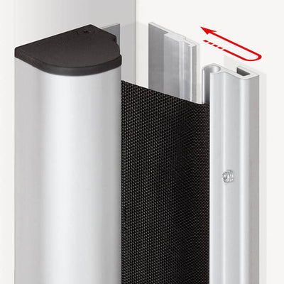 Astro Finger Defender RPQR - quick release system is a high quality finger guard with resilient blind. When the door opens the roller blind extends to prevent fingers entering the cavity formed between the edge of the door and door frame. A hard wearing synthetic fibre fabric which is mountable, removable, washable and also fire retardant B1 treated.