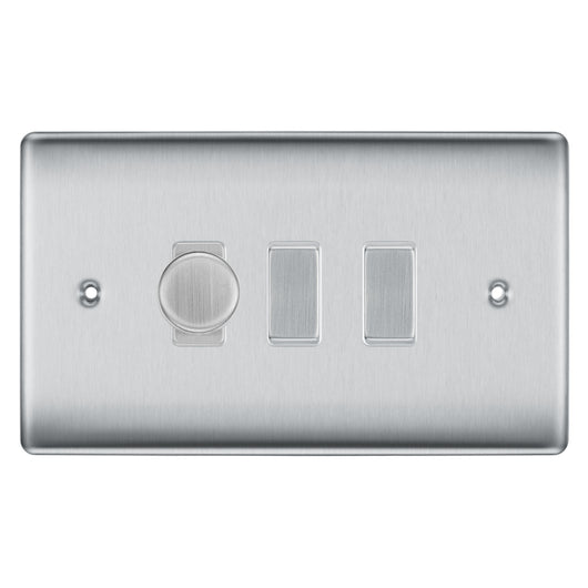 BG Brushed Steel 3 Gang Switch 1x Trailing Edge LED Dimmer 2x 2 Way Custom Grid