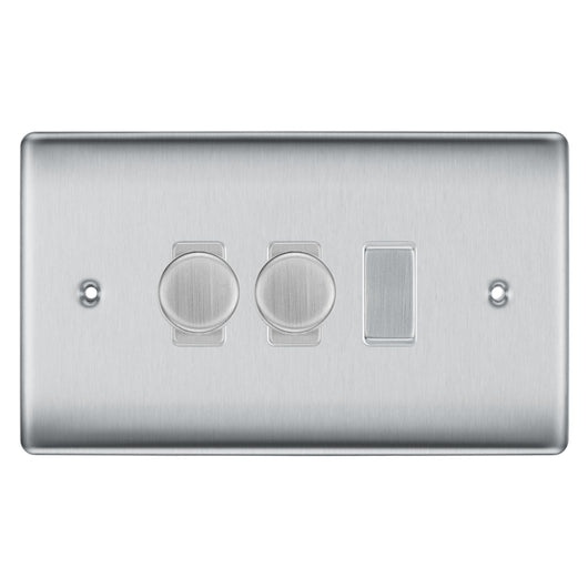 BG Brushed Steel 3 Gang Switch 2x Trailing Edge LED Dimmer 1x 2 Way Custom Grid