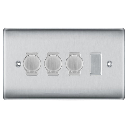 BG Brushed Steel 4 Gang Switch 3x Trailing Edge LED Dimmer 1x 2 Way Custom Grid