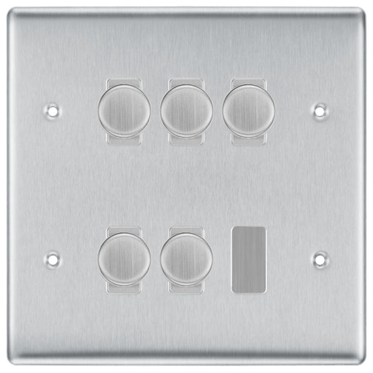 BG Brushed Steel 5 Gang 2 Way Trailing Edge Dimmer LED Compatible Custom Grid