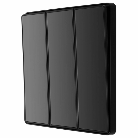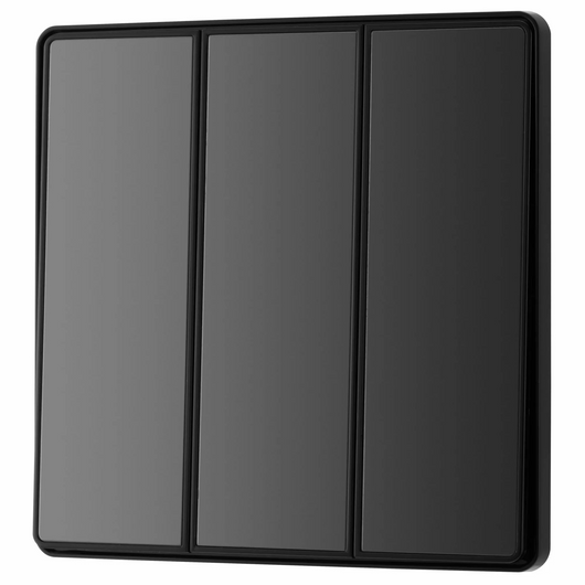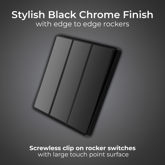 This Evolve 20A triple light switch from BG will operate three lights in a room. The 2 way switch lets a second switch be added to the circuit, allowing the customer to operate the same lights from another location, e.g. either side of a room, or top and bottom of the stairs. The low profile edge-to-edge rockers clip in to place once the base is installed for a screwless appearance, with a large touch surface for easy operation and black chrome finish. Installation is fast and secure with clearly labelled captive backed out terminal screws.