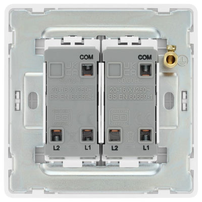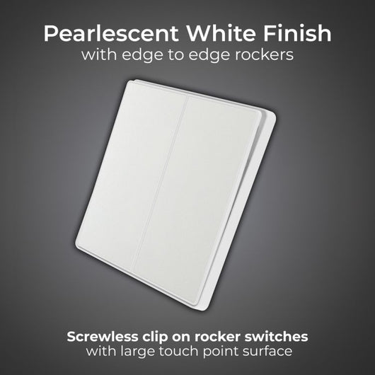 This BG Evolve Pearlescent White 2 Gang 2-Way 20A Edge to Edge Rocker Light Switch will operate one light in a room. The 2-way switching allows a second switch to be added to the circuit to operate the same light from another location (e.g. at the top and bottom of the stairs). This switch has edge to edge rockers and a low profile screwless flat plate that clips on and off, making it ideal for modern interiors.