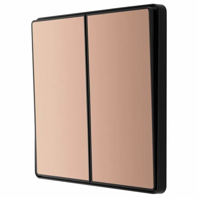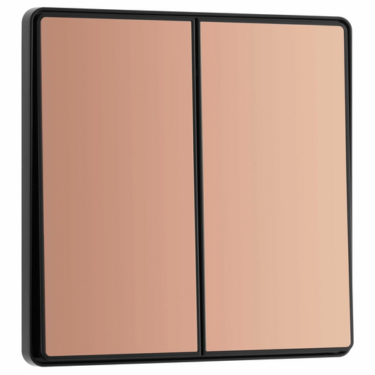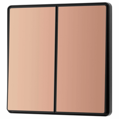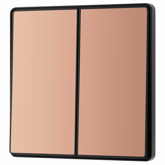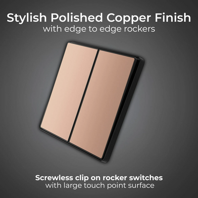 This BG Evolve Polished Copper 2 Gang 2-Way 20A Edge to Edge Rocker Light Switch will operate one light in a room. The 2-way switching allows a second switch to be added to the circuit to operate the same light from another location (e.g. at the top and bottom of the stairs). This switch has edge to edge rockers and a low profile screwless flat plate that clips on and off, making it ideal for modern interiors.