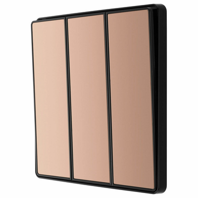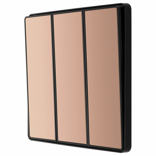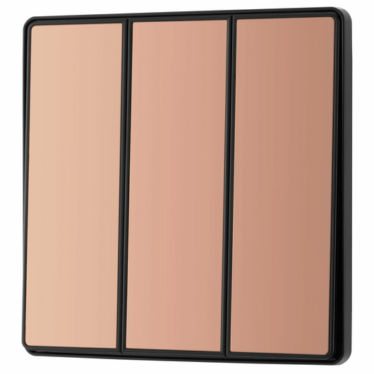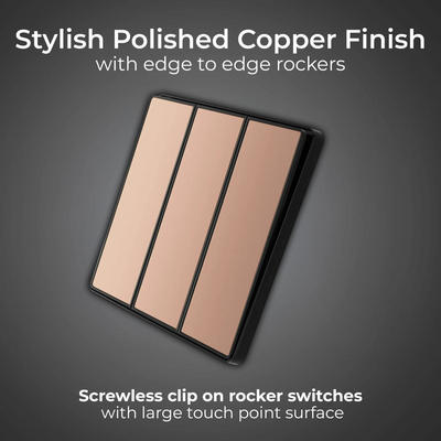 This BG Evolve Polished Copper 3 Gang 2-Way 20A Edge to Edge Rocker Light Switch will operate one light in a room. The 2-way switching allows a second switch to be added to the circuit to operate the same light from another location (e.g. at the top and bottom of the stairs). This switch has edge to edge rockers and a low profile screwless flat plate that clips on and off, making it ideal for modern interiors.
