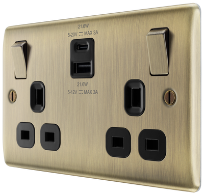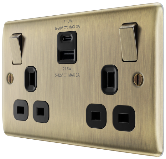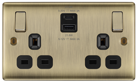 BG NAB22UAC22B Antique Brass Double Socket with USB 22W Type A & Type C USB