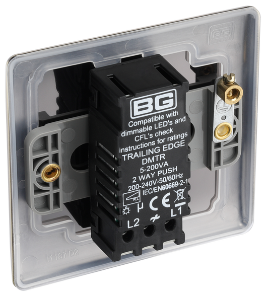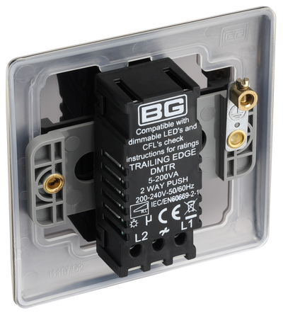 The NAB81 has a smooth control with no noise while dimming, and accounts for lower-wattage lamps in order to eliminate flickering. These dimmer switches come with BG’s soft start technology, bringing lamps to a set level of light in the space of a second and so prolonging their lifespan. They also protect against overloading by automatically lowering the power sent to lights or transformers if too many are connected, keeping the consumer safe.
