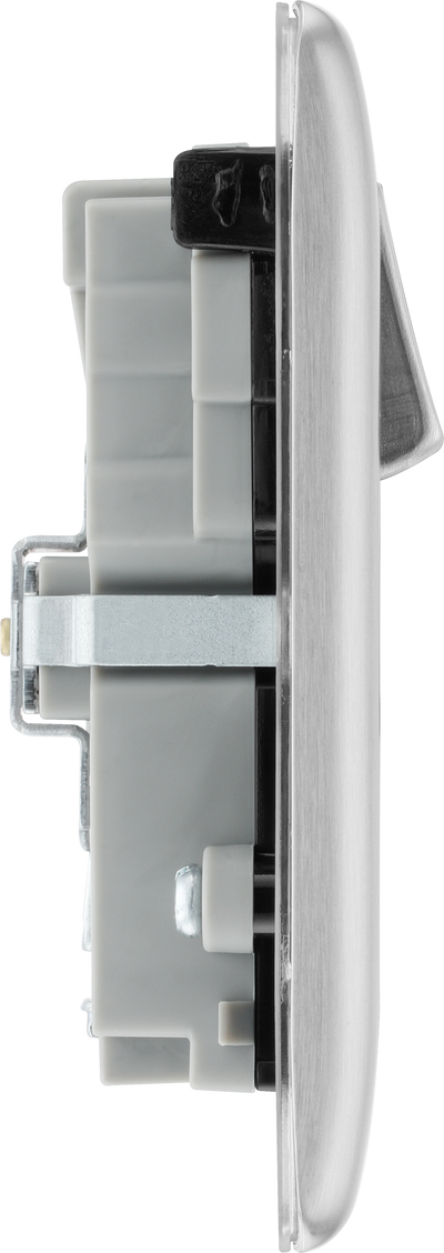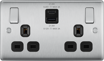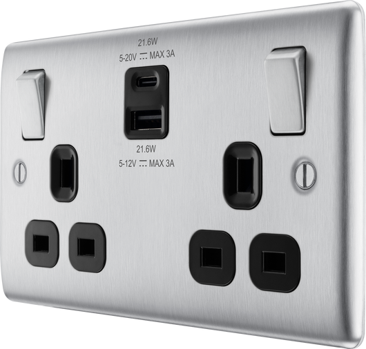 BG NBS22UAC22B Brushed Steel Double Socket with USB 22W Type A & C USB Black Inserts