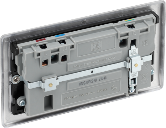 This 13A double socket from British General comes with integrated fast charge USB-A and USB-C ports, allowing you to plug in an electrical device and charge mobile devices simultaneously without having to sacrifice a power socket. The 22 Watt variable voltage fast charging supports PD & QC charging protocols for Android and iOS devices, and auto-detects the USB device and adjusts the charging pattern to suit. This socket has a sleek and slim profile with softly rounded edges and no visible plastic around the switches to add a touch of luxury to your decor. Designed with angled in line colour coded terminals and backed out captive screws for ease of installation, and fits a 25mm back box making it an ideal retro-fit replacement for existing sockets.