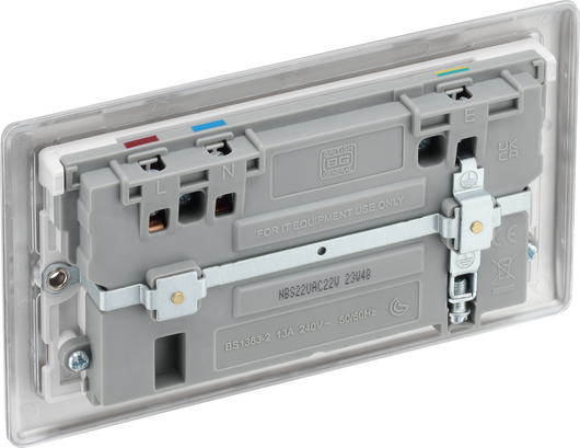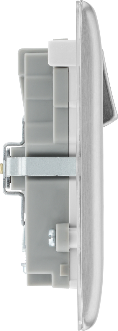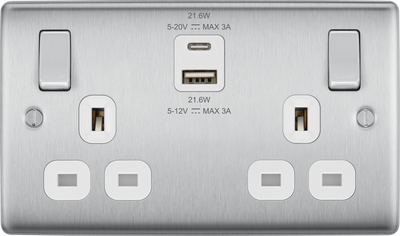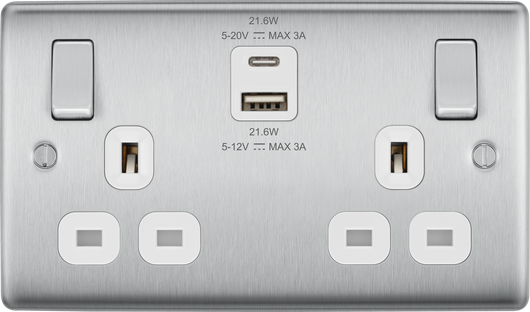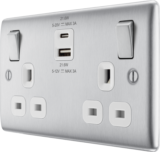 BG NBS22UAC22W Brushed Steel Double Socket with USB 22W Type A & C USB White Inserts