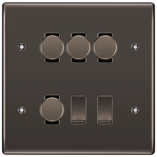 BG Nexus Black Nickel 6 Gang Switch 4x Trailing Edge LED Dimmer 2x 2Way Custom Grid Switch