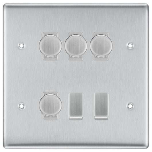 BG Nexus Brushed Steel 6 Gang Switch 4x Trailing Edge LED Dimmer 2x Intermediate Custom Grid Switch