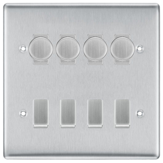 BG Nexus Brushed Steel 8 Gang Switch 4x Trailing Edge LED Dimmer 4x Intermediate Custom Grid Switch