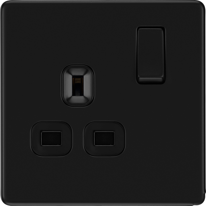 This Screwless Flat plate matt black finish 13A single switched socket from British General has a sleek flat profile that clips on and off for a screwless premium finish with no visible plastic around the switch. The clip off front plate makes decorating easier, whilst the moisture control gasket prevents tarnishing from new plaster. This socket has been designed with angled in line colour coded terminals and backed out captive screws for ease of installation, and fits a 25mm back box making it an ideal retro-fit replacement for existing sockets.