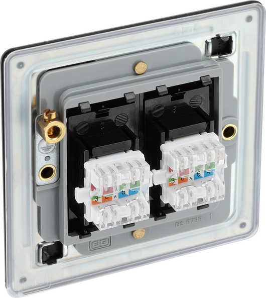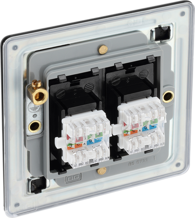 This RJ45 ethernet socket from British General uses an IDC terminal connection and is ideal for home and office providing 2 networking outlets with ID windows for identification. The Cat6 outlet supports data transfer speeds of up to 10Gbps at 250 MHz up to 164 feet. This socket has a matt black nfinish and is supplied as kit of Euro module components, with an ultra-slim screwless flat plate that clips on and off and sits flush against the wall. Ideal for modern interiors.