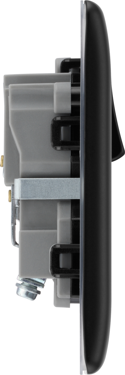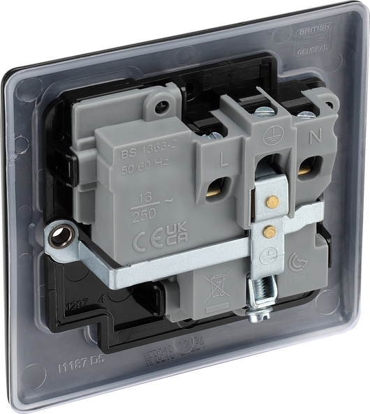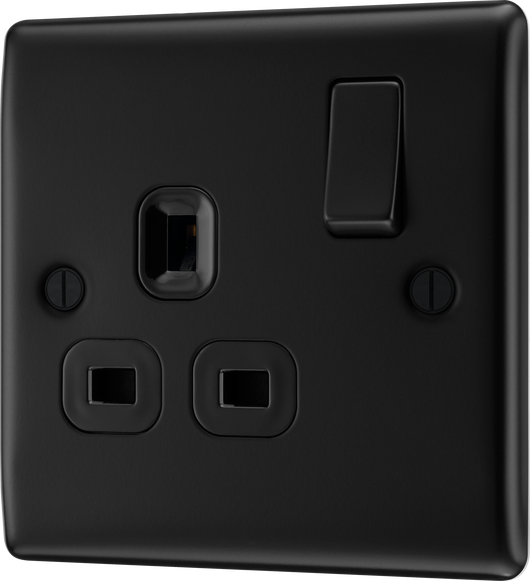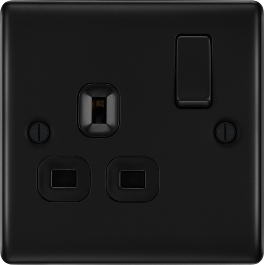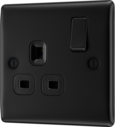 This matt black finish 13A single switched socket from British General has a sleek and slim profile with softly rounded edges and no visible plastic around the switch to add a touch of luxury to your decor. This socket has been designed with angled in line colour coded terminals and backed out captive screws for ease of installation, and fits a 25mm back box making it an ideal retro-fit replacement for existing sockets.