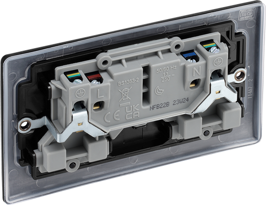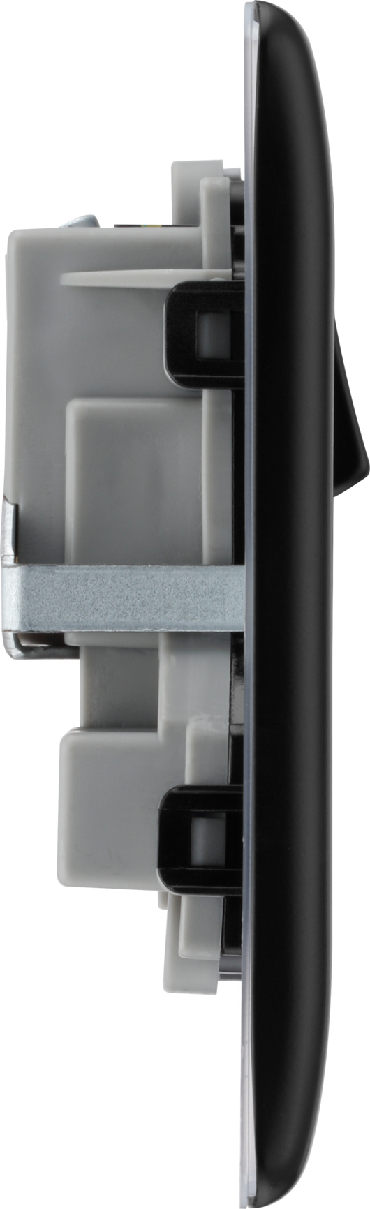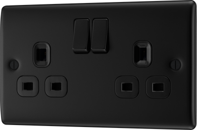 This matt black finish 13A double switched socket from British General has a sleek and slim profile with softly rounded edges and no visible plastic around the switches to add a touch of luxury to your decor. This socket has been designed with angled in line colour coded terminals and backed out captive screws for ease of installation, and fits a 25mm back box making it an ideal retro-fit replacement for existing sockets.