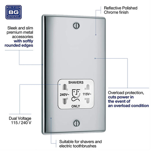 BG NPC20W Nexus Metal Polished Chrome 115-230V Dual Voltage Shaver Socket - White Insert