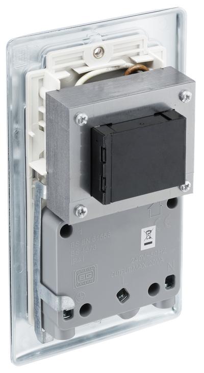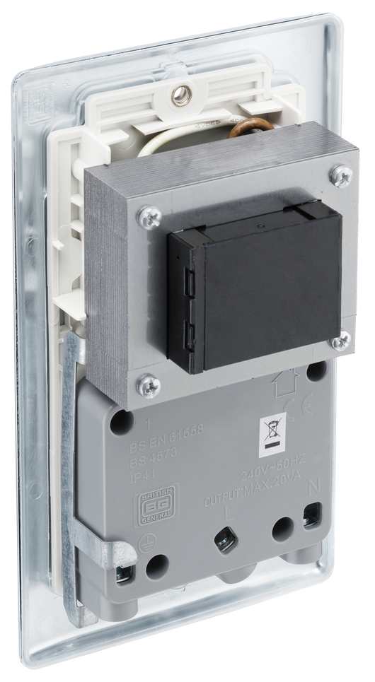 The BG Electrical Nexus Metal NPC20W is a polished chrome shaver socket outlet with grey inserts, manufactured by British General Electrical.
