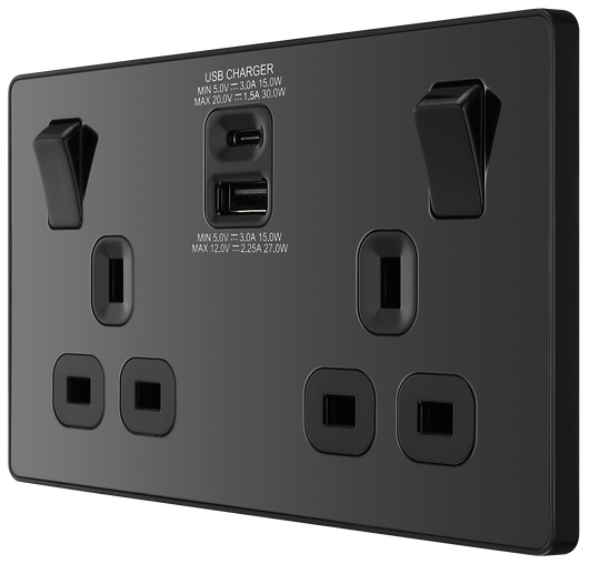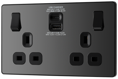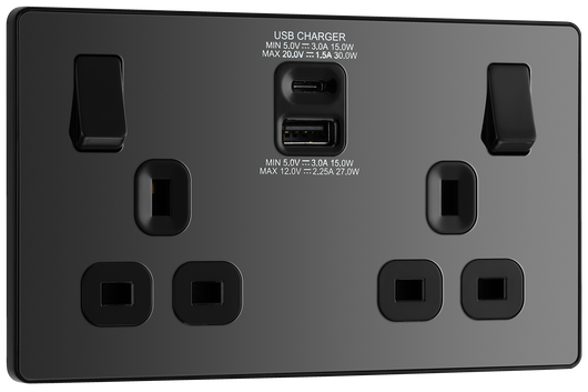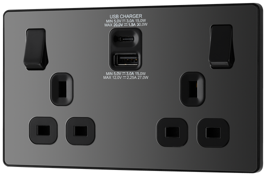 BG PCDBC22UAC30B Black Chrome Evolve 2 Gang 13A 1x USB-QC A 27W 1x USB-PD C 30W Switched Socket - Black Insert