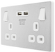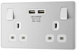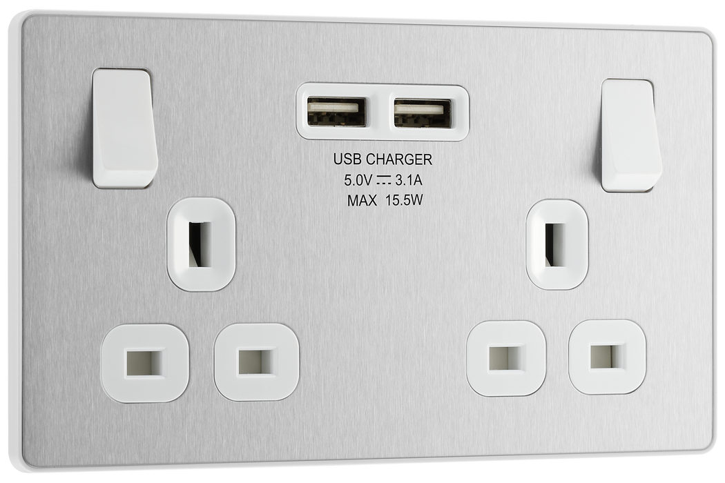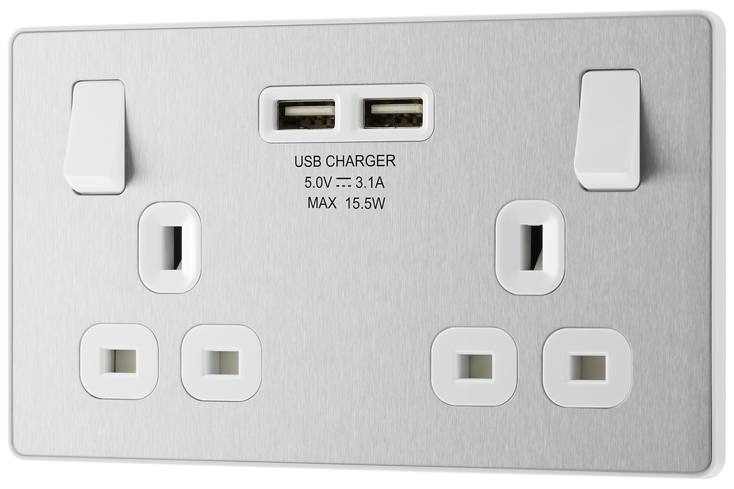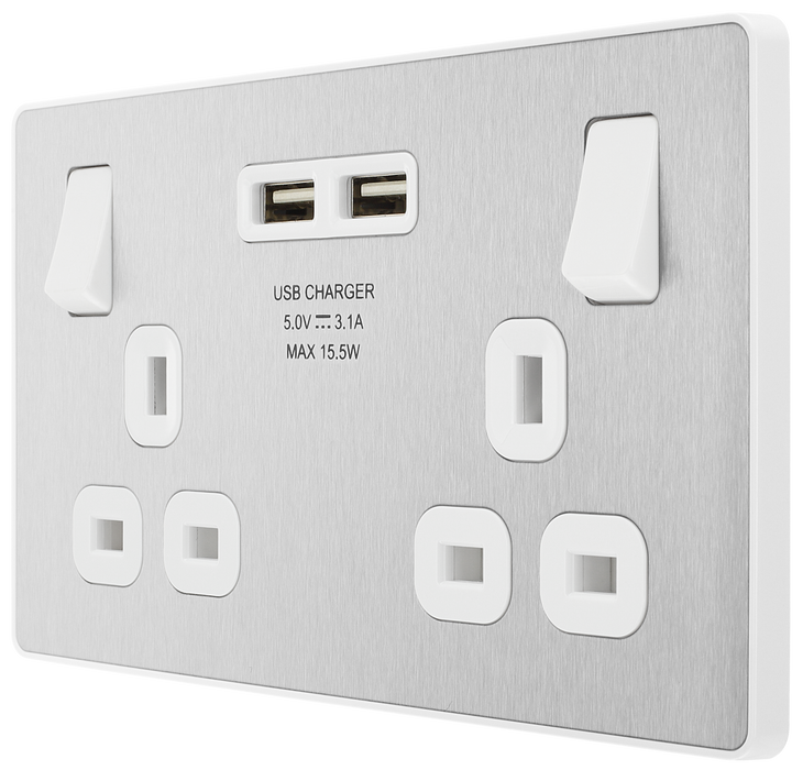 BG PCDBS22U3W Brushed Steel Evolve 2 Gang 13A 2x USB-A 3.1A Switched Socket Outlet - White Insert