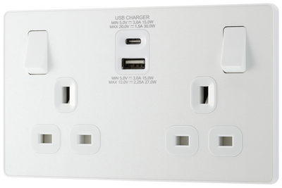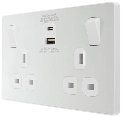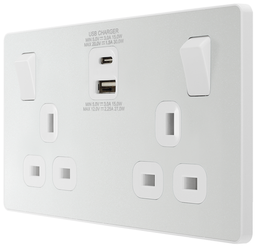 BG PCDCL22UAC30W Pearlescent White Evolve 2 Gang 13A 1x USB-QC A 27W 1x USB-PD C 30W Switched Socket - White Insert is currently out of stock