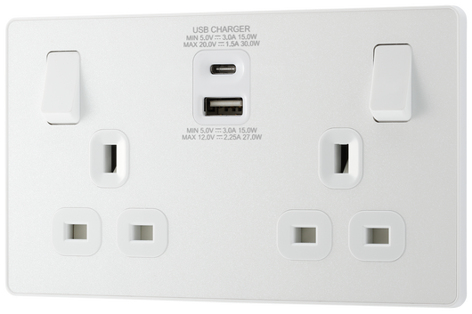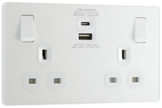 BG PCDCL22UAC30W Pearlescent White Evolve 2 Gang 13A 1x USB-QC A 27W 1x USB-PD C 30W Switched Socket - White Insert