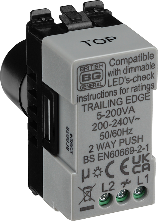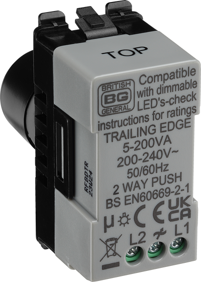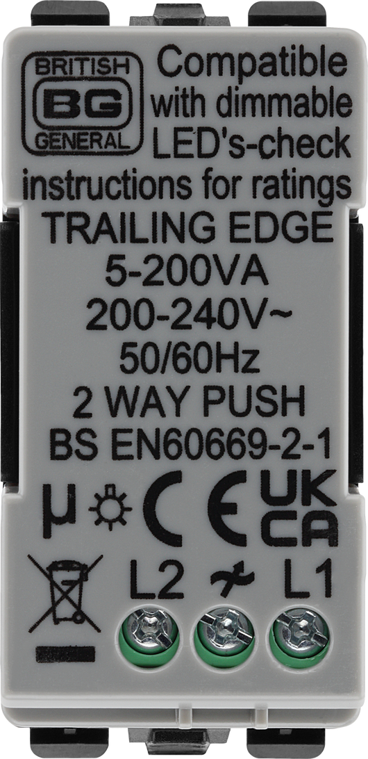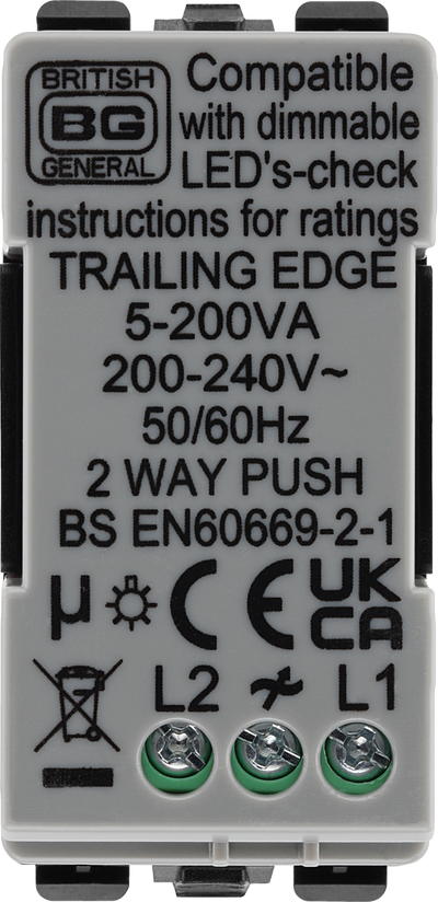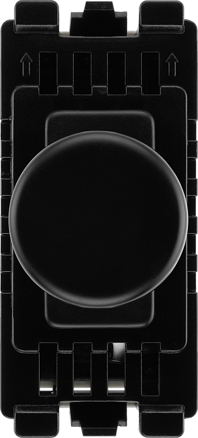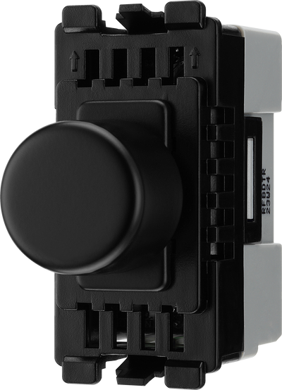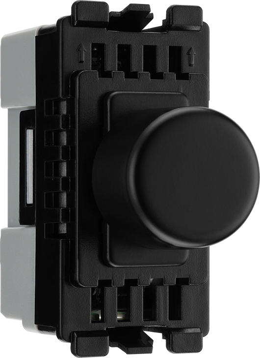 The Grid module range from British General allows you to build your own module configuration with a variety of combinations and finishes. This matt black finish trailing edge single dimmer module allows you to control your light levels and set the mood. The intelligent electronic circuit monitors the connected load and provides a soft-start with protection against thermal current and voltage overload, and is suitable for dimming LED, dimmable CFL's and traditional lighting.