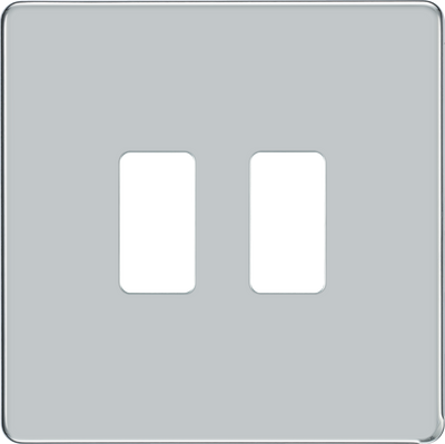 The BG Electrical Nexus Grid RFPC2 is a polished chrome screwless flat front plate with 2 module spaces.