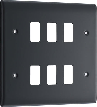 The Grid modular range from British General allows you to build your own module configuration with a variety of combinations and finishes. Ideal for part M applications to aid the visually impaired this sleek and slim black finish front plate has softly rounded edges and colour matched screws for a sleek appearance. The aperture can accommodate 6 Grid modules - ideal for switches and other domestic applications.