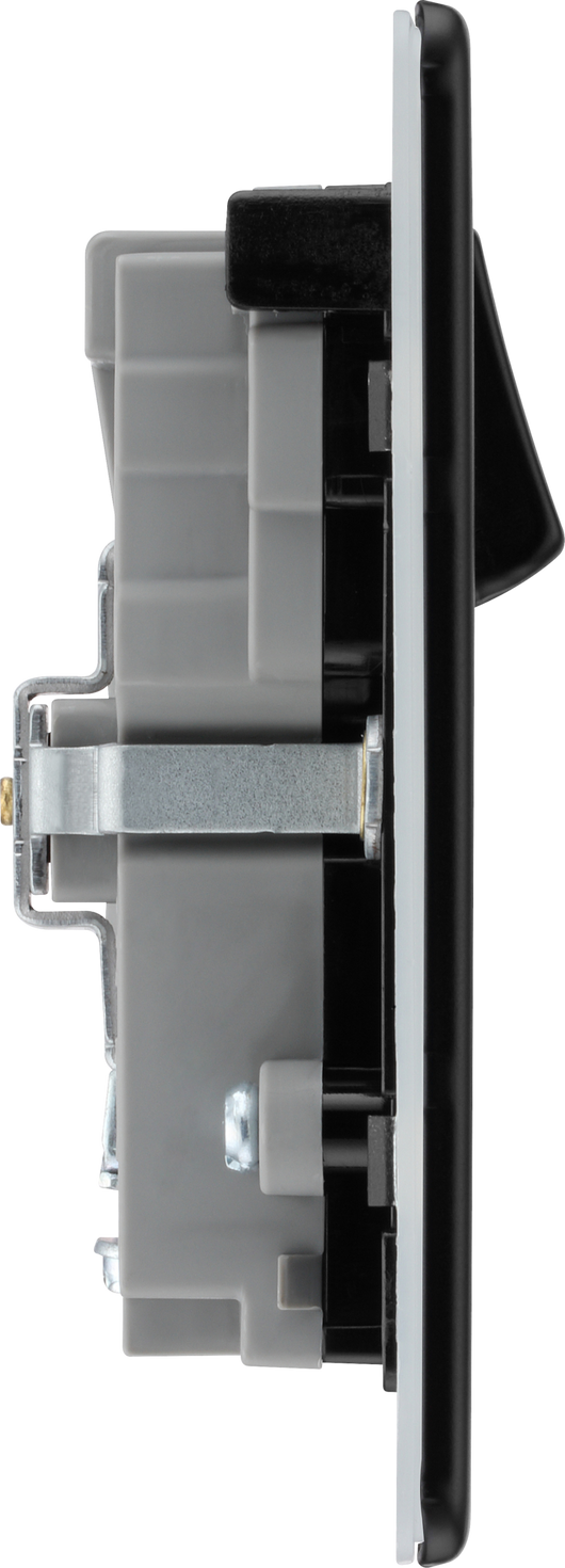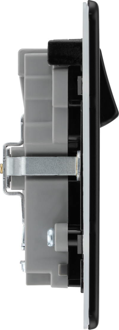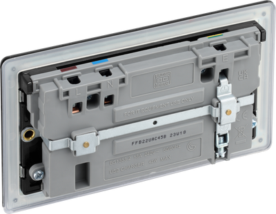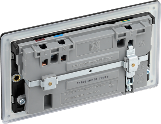 This 13A power socket from British General with integrated fast charge USB-A and USB-C ports. The 45 Watt variable voltage fast charging supports PD & QC charging protocols for Android and iOS devices, and auto-detects the USB device and adjusts the charging pattern to suit. The matt black finish screwless flat plate clips on and off, making it ideal for modern interiors. Designed with angled in line colour coded terminals and backed out captive screws for ease of installation.
