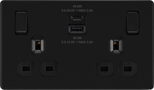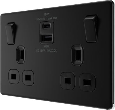 BG Screwless FFB22UAC45B Matt Black Double Socket with USB 45W Type A & C USB