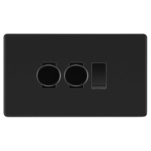 BG Screwless Flatplate Matt Black 3 Gang Grid Switch 2x Trailing Edge LED Dimmer 1x 2 Way