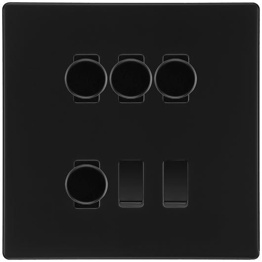 BG Screwless Matt Black 6 Gang Switch 4x Trailing Edge LED Dimmer 2x 2Way Custom Grid Switch