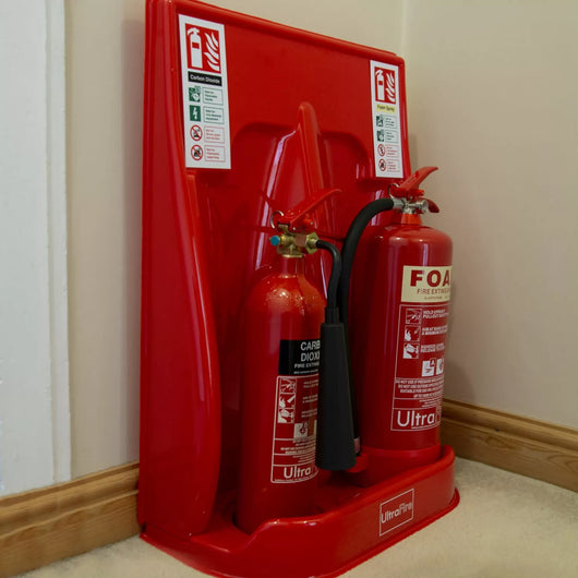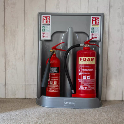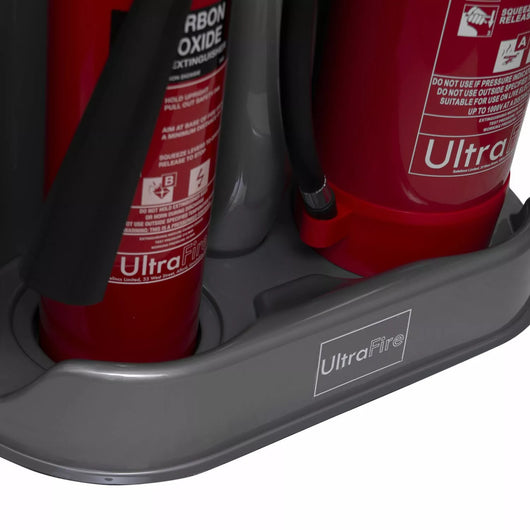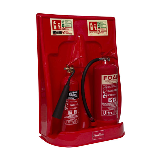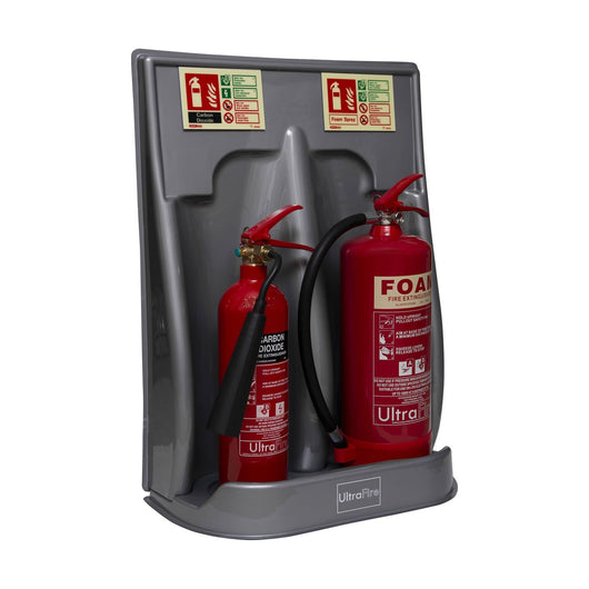 The UltraFire double universal economy fire extinguisher stand will hold two fire extinguishers. A "multi-disc" system built into the base makes the stand suitable for a full range of extinguisher sizes from a 2kg CO2 to a 9ltr water. Made in the UK from durable and fully recyclable materials.