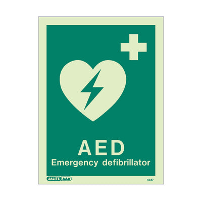 In the event of a sudden cardiac arrest, every second counts when trying to save the patient's life. Emergency AED defibrillator signs are essential in helping to assist occupants and emergency services to quickly locate defibrillation equipment. Available with or without text, these emergency defibrillator signs are made from photoluminescent rigid plastic, making the signs visible in complete darkness.