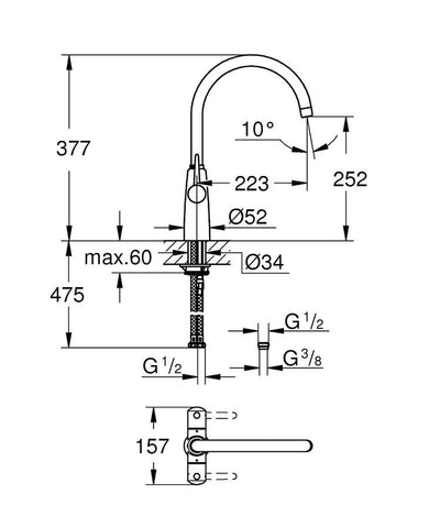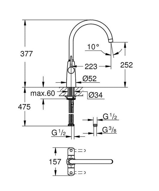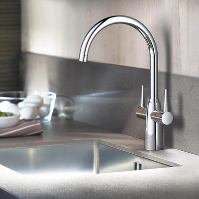 Sleek and slim, the Grohe Ambi Two Handle Kitchen Sink Mixer will bring a distinctly modern look to your basin. Its U-shaped spout sits at 377mm high – lock it in place, or swivel round to direct the flow for easy rinsing. The Grohe SilkMove cartridge inside allows the lever to move smoothly, even after years of use. Finished with a scratch resistant Grohe StarLight chrome coating, this Grohe Ambi kitchen tap is also easy to clean.