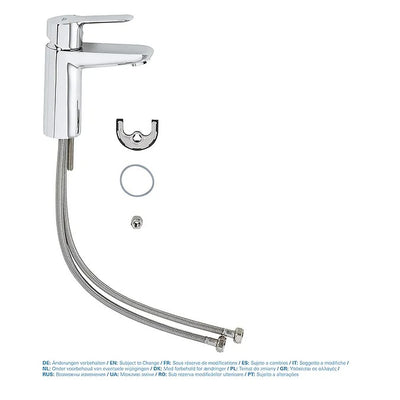 Streamline your bathroom with the sleek silhouette of the GROHE BauEdge single-lever basin mixer; and youÕll also benefit from its smooth operation and water-saving credentials. Designed with a smooth body for basins that donÕt require a waste; operation is via the lozenge-shaped solid metal lever handle; and the standard height spout; angled for user comfort; is the perfect companion for all regular wash basins