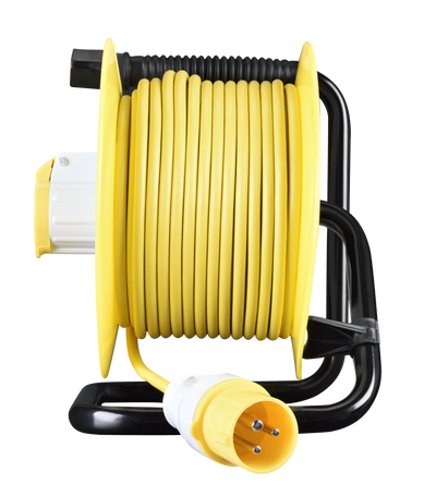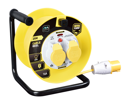 This Masterplug 25 metre open cable reel is great it comes to using portable power on site. This heavy duty open reel with its large drum has been designed and engineered for longevity. This rugged cable reel has two 110V 16A sockets and high visibility cable, making it perfect for site applications. The cable reel features a LED indicator, integrated power switch and cable guide for ease of use. A safety thermal cut-out for protection against overloading when fully reeled.