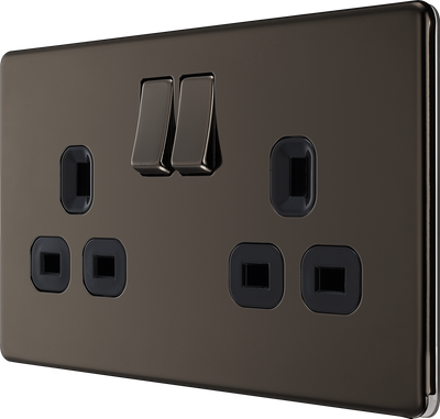 The BG Electrical Nexus Screwless Flat-Plate FBN22B is a black nickel double (2 gang) switched electrical socket with black inserts, manufactured by British General Electrical.