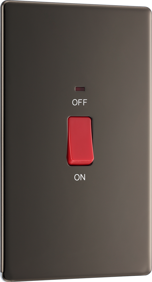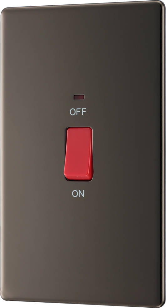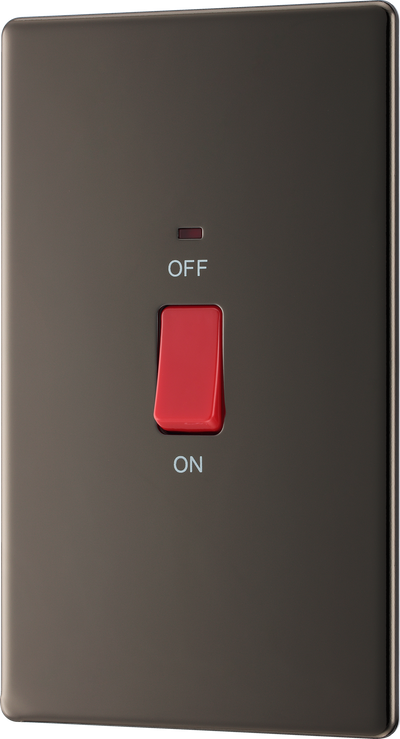 The BG Electrical Nexus Screwless Flat-Plate FBN72 is a black nickel 45A large plate cooker switch with a neon, manufactured by British General Electrical.