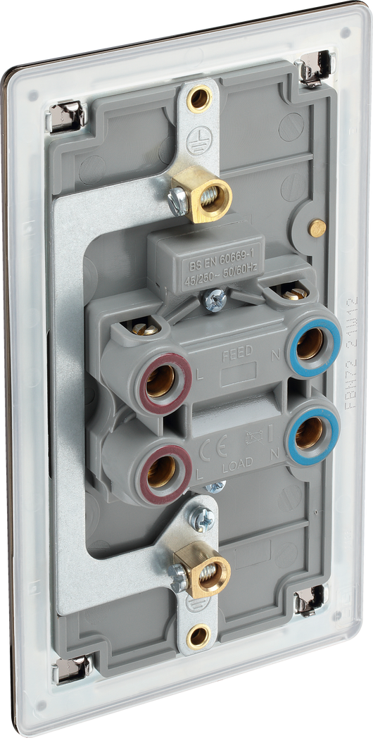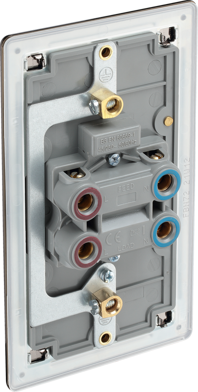 The Clip On, Clip off front plate design is secure and easy to use, and the FBN72 can be retrofitted into existing backboxes (47mm minimum depth required). Itβs also supplied with colour-coded terminals, backed-out captive screws to make installation as simple as possible and 2 earth terminals to facilitate a high integrity wiring connection.