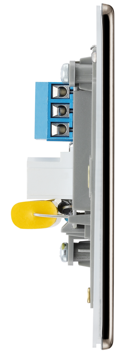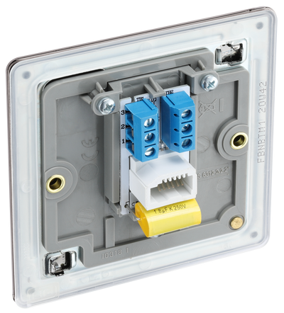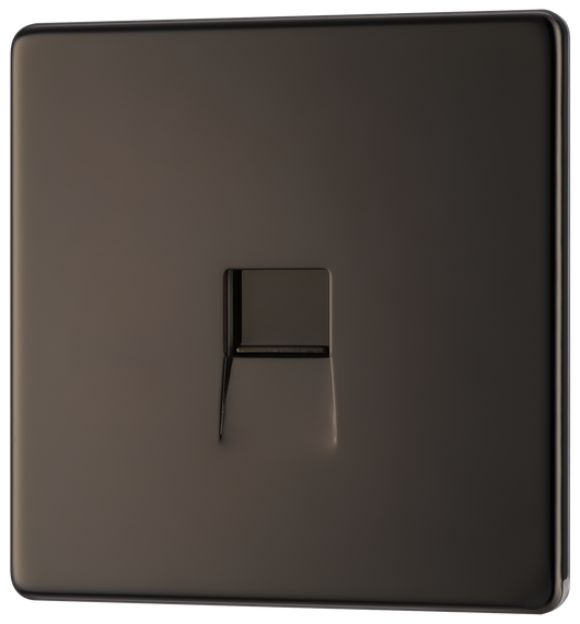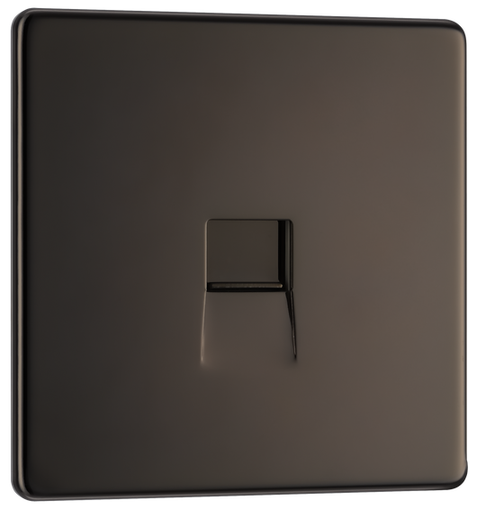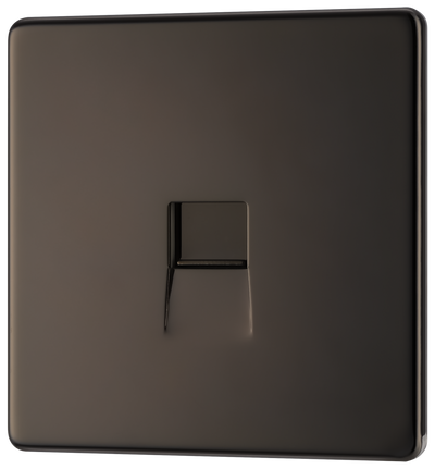 The BG Electrical Nexus Screwless Flat-Plate FBNBTM1 is a black nickel single (1 gang) master telephone socket, manufactured by British General Electrical.