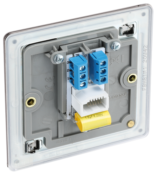 The FBNBTM1 is a single master telephone socket that is suitable for both the home and the office. With an extremely thin plate (under 5mm thick from wall to face), flat profile, rounded edges and stylish black nickel finish, the FBNBTM1 has a sleek, modern design to suit a wide range of interior decor.