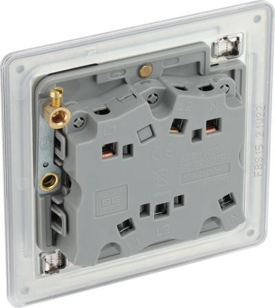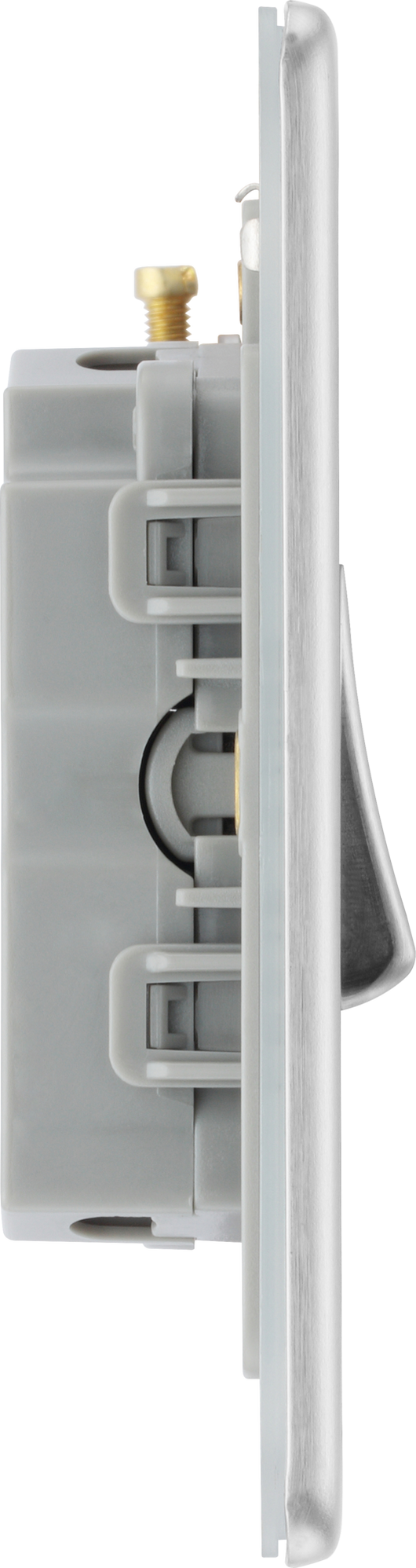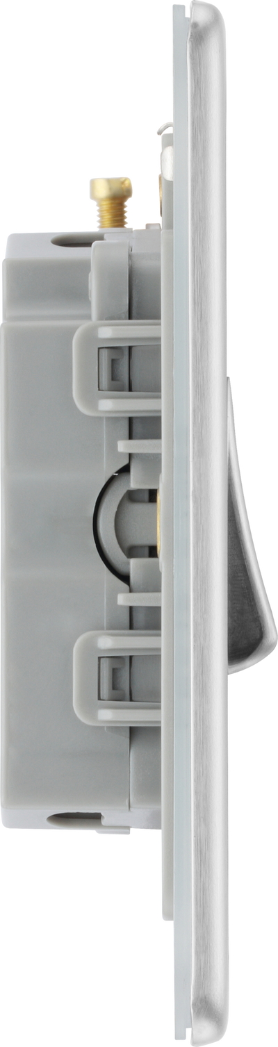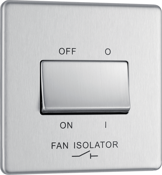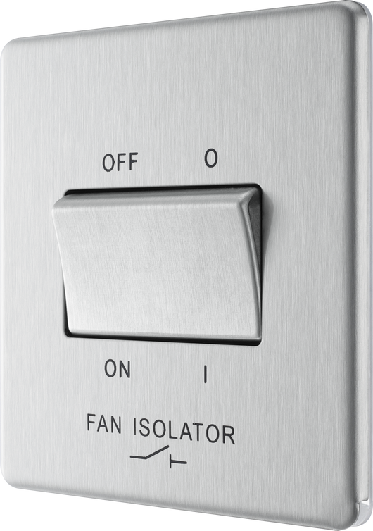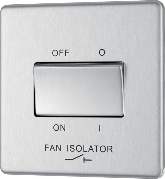 The BG Electrical Nexus Screwless Flat-Plate FBS15 is a brushed steel 3-pole 10A fan isolator switch, manufactured by British General Electrical.